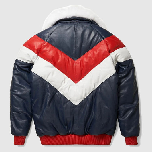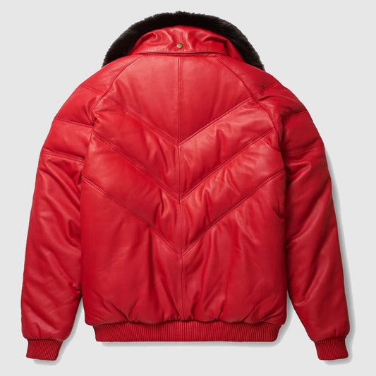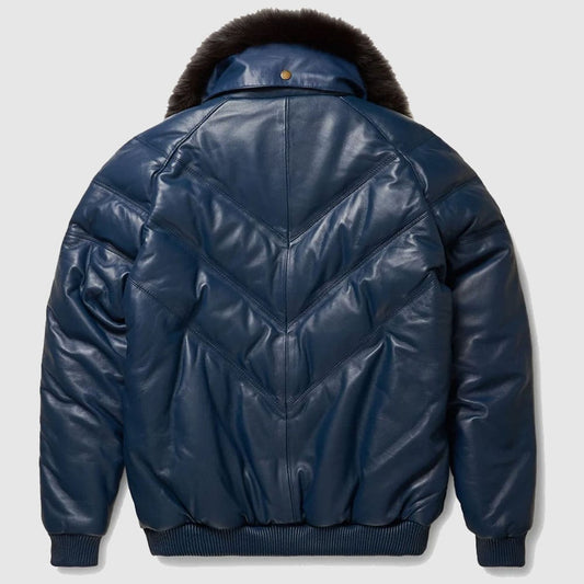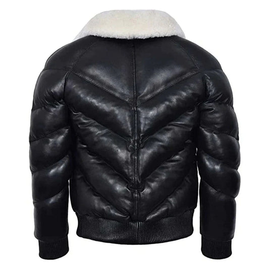 Men’s Leather V Bomber Puffer Winter Jacket with Fur Collar