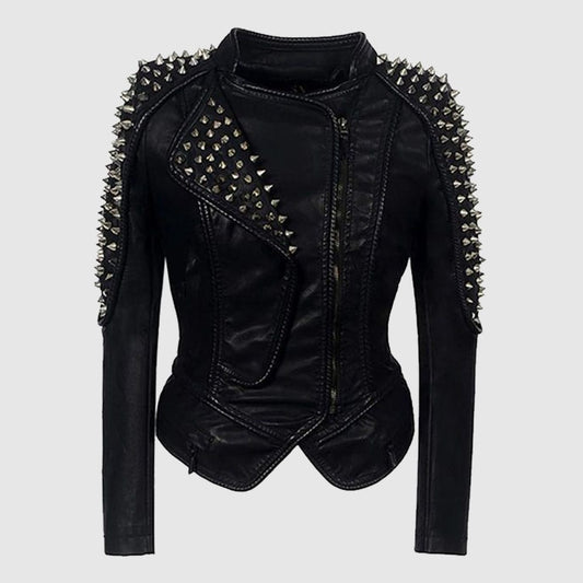 Handmade Black Color Women Silver Metal Studded Punk Leather Jacket