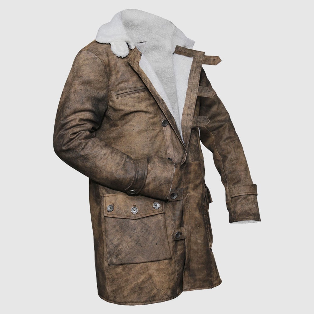 Do you remember the Tom Hardy Bane coat from Batman: The Dark Knight Rises? This bane leather jacket is a heavyweight shearling outfit to save you from extreme cold. We utilize 100% genuine and high-quality cow leather to make this Bane outfit leather. The interior of this shearling jacket is augmented with quality shearling lining to provide comfort to the wearer. The Bane style jacket also has 2 giant size button hand pockets along with 2 chest and 2 inner pockets.