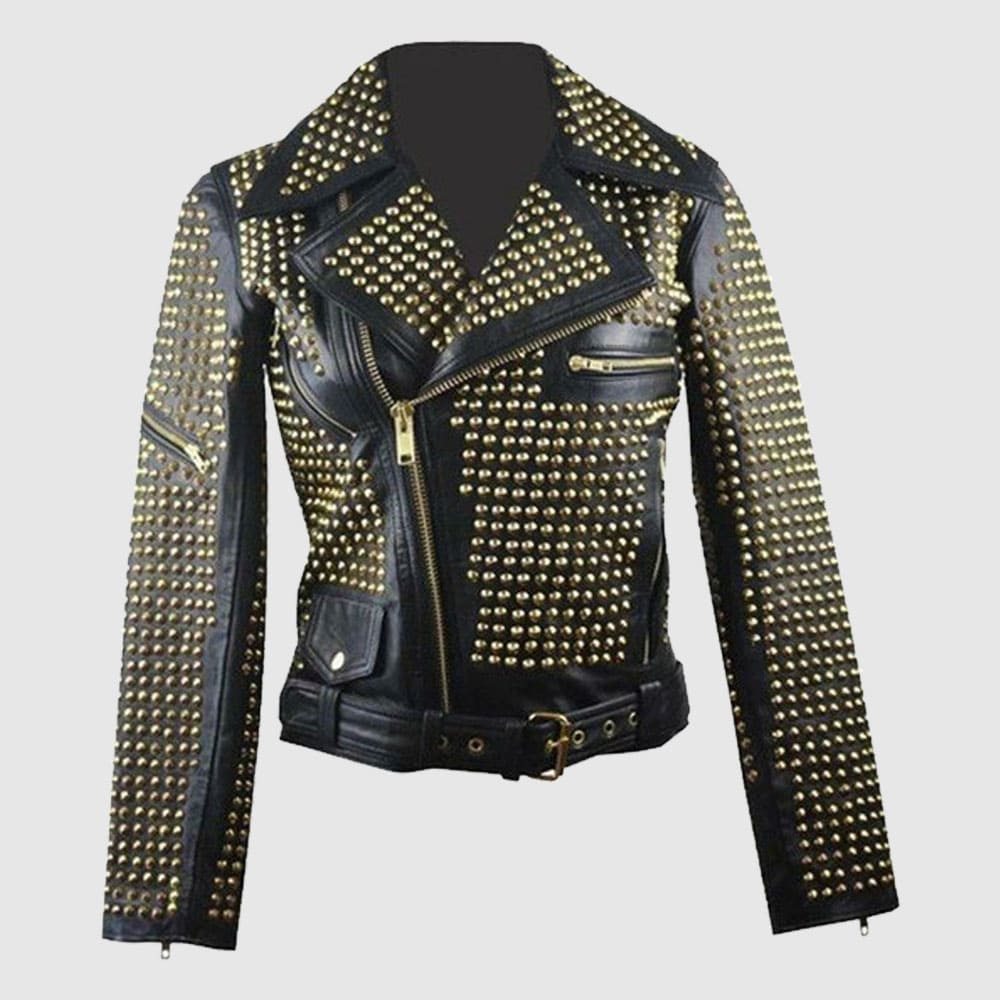 Ladies Black Leather Golden Studded Stylish Jacket Studded Punk Jacket