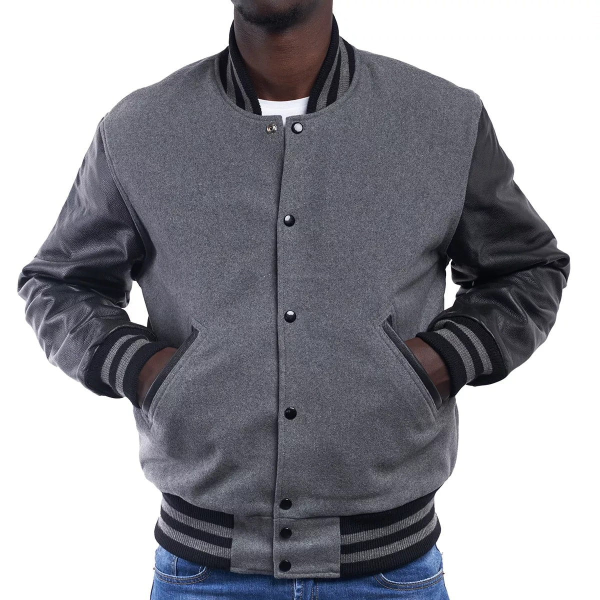 Light Oxford Wool Body & Black Leather Sleeves Letterman Jacket