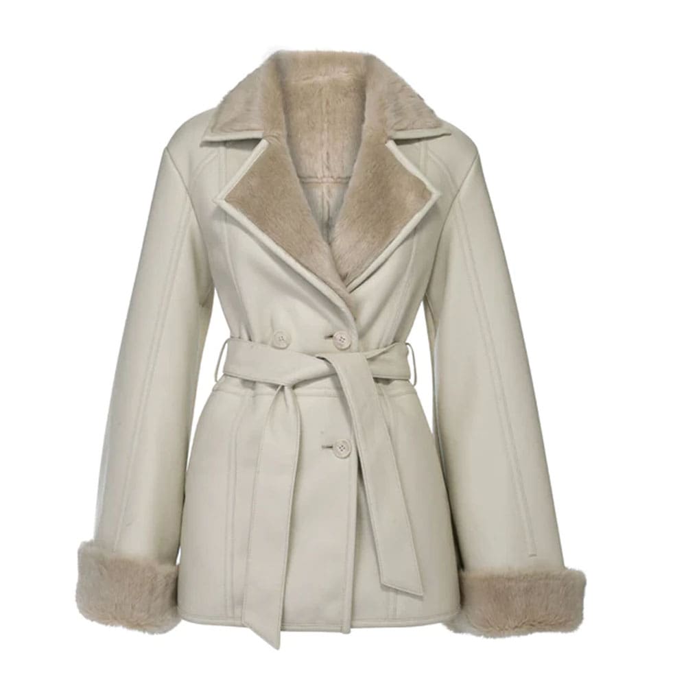 Double breasted bonded Genuine leather & faux fur jacket with Genuine leather extended length self tie belt.