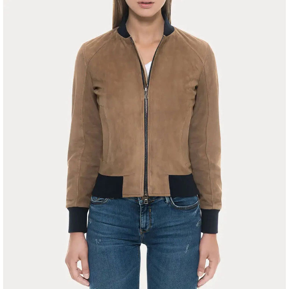 Tan Suede Bomber Jacket with Black Rib Knit Collar & Cuffs